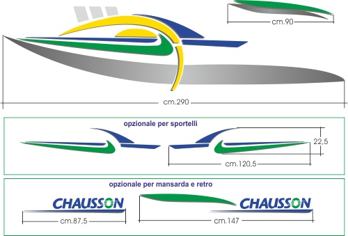 Kit adesivi per Chausson vari modelli Questo disegno ripropone le grafiche del camper Chausson. I..