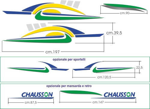 Kit adesivi per Chausson vari modelli Questo disegno ripropone le grafiche del camper Chausson. I..